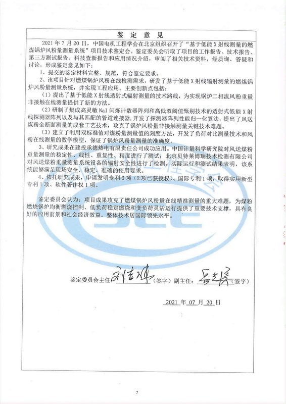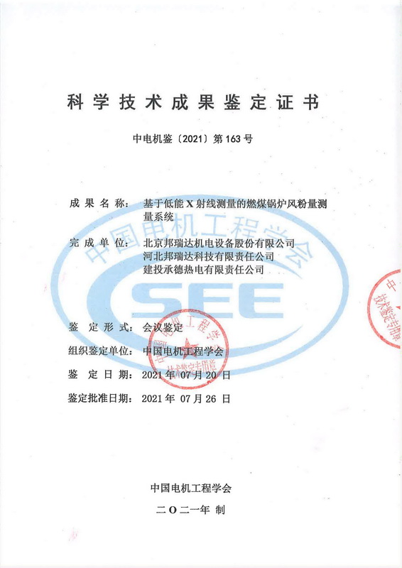 2021年7月20日,中國(guó)電機(jī)工程學(xué)會(huì)在北京組織召開了“基于低能X射線測(cè)量的燃煤鍋爐風(fēng)粉量測(cè)量系統(tǒng)”項(xiàng)目技術(shù)鑒定會(huì)。